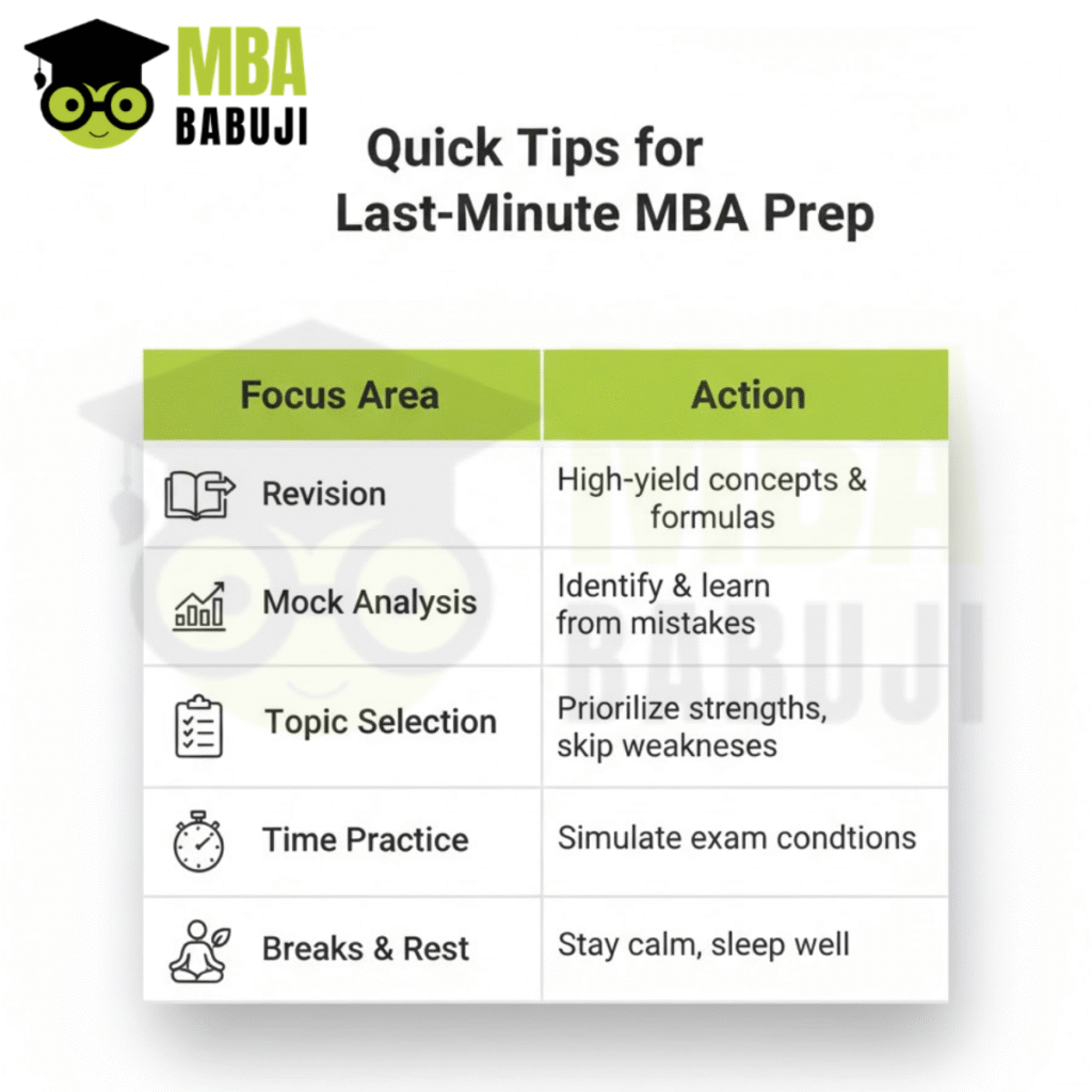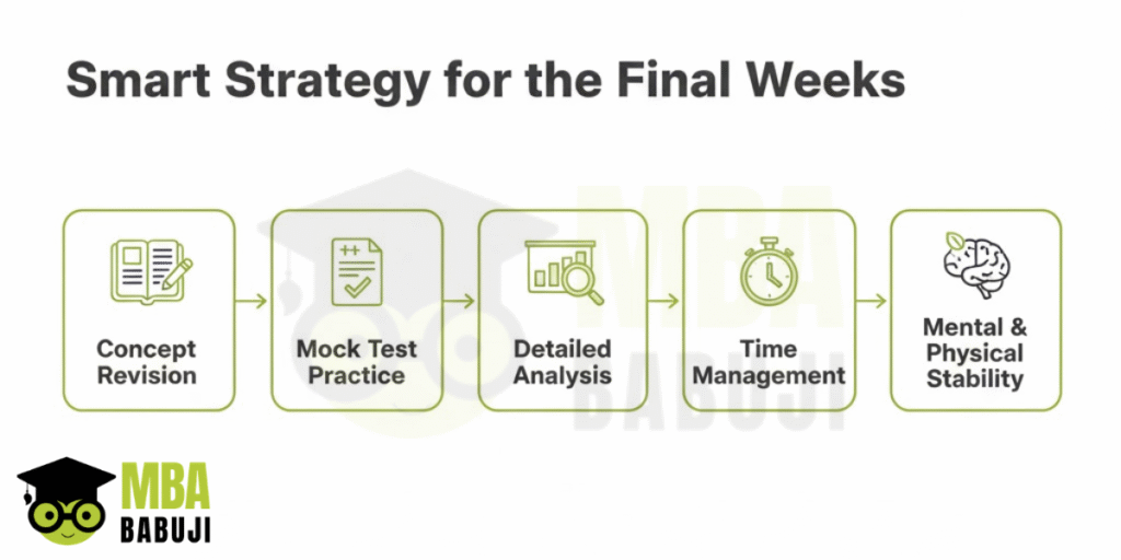 In the final weeks before your MBA exams, quality matters more than quantity. Over-reliance on shortcuts can create false confidence, waste time, and increase stress. Instead, focus on revision, strategic mocks, and conceptual clarity. A disciplined, targeted approach in these last weeks can significantly improve your scores and give you the confidence to perform at your best on exam day.